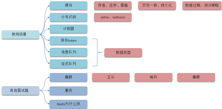 缓存 分布式锁 计数器 保存token, 短信验证码等 消息队列 延迟队列