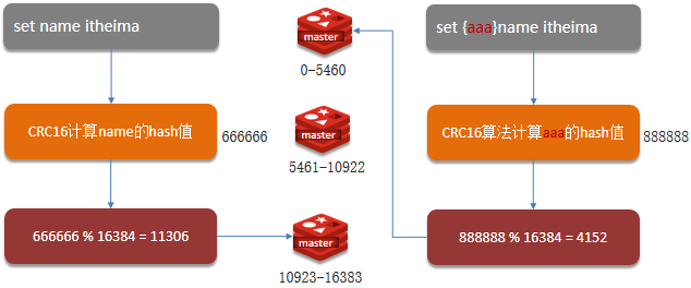 set {aaa}name itheima → CRC16算法计算aaa的hash值 → 888888 % 16384 = 4152 (master1)