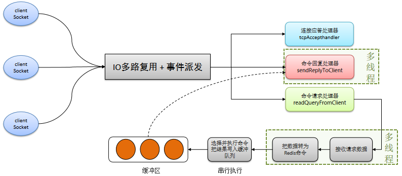 ❒ I/O多路复用 是指利用单个线程来同时监听多个socket,并在某个socket可读、可写时得到通知,从而避免无效的等待,充分利用CPU资源。目前的I/O多路复用都是采用的epoll模式实现,它会在通知用户进程socket就绪的同时,把已就绪的socket写入用户空间,不需要挨个遍历socket来判断是否就绪,提升了性能。 ❒ redis网络模型 ✔ 就是使用I/O多路复用结合事件的处理器来应对多个socket请求连接应答处理器 ✔ 命令回复处理器,在redis6.0之后,为了提升更好的性能,使用了多线程来处理回复事件 ✔ 命令请求处理器,在redis6.0之后,将命令的转换使用了多线程,增加命令转换速度,在命令执行的时候,依然是单线程