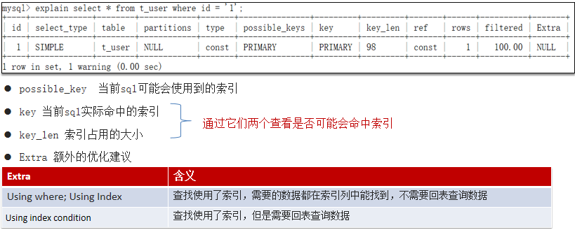 ✔ Extra → Using index condition(查找使用了索引,但是需要回表查询数据)