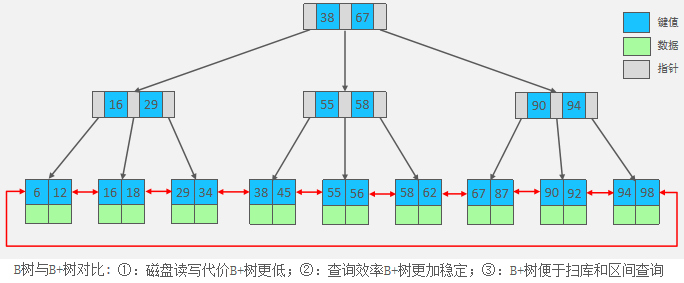 ✔ 叶子节点之间用指针连接,提高区间访问的性能(也就是说在每个叶子之间有一个指针,这个是B-Tree所没有的。有了这个指针可以范围查询。)