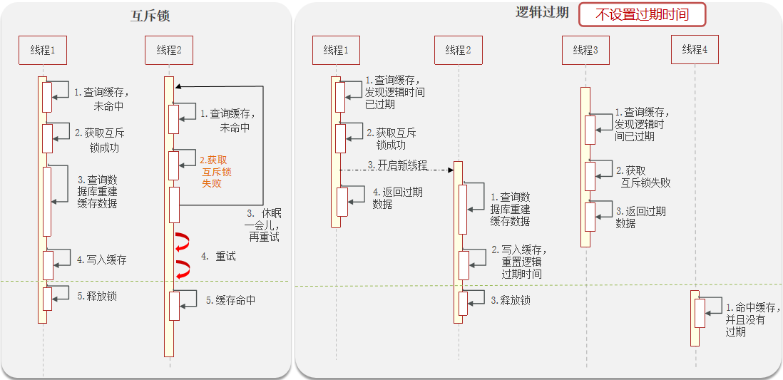 互斥锁,强一致,性能差 逻辑过期,高可用,性能优,不能保证数据绝对一致