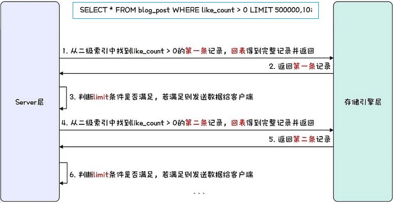 ❒ 在数据量比较大时,如果进行limit分页查询,在查询时,越往后,分页查询效率越低。 ✔ 我们一起来看看执行limit分页查询耗时对比: mysql:SELECT * FROM blog_post WHERE like_count › 0 LIMIT 0,10; (10 rows in set 0.00 sec) mysql:SELECT * FROM blog_post WHERE like_count › 0 LIMIT 9000000,10; (10 rows in set 11.05 sec) ✔ 因为,当在进行分页查询时,如果执行limit 9000000,10,此时需要MySQL排序前9000010 记录,仅仅返回9000000 - 9000010的记录,其他记录丢弃,查询排序的代价非常大。 ✔ 优化后:SELECT * FROM blog_post t, (SELECT id FROM blog_post WHERE like_count › 0 LIMIT 9000000,10) a WHERE t.id = a.id;
