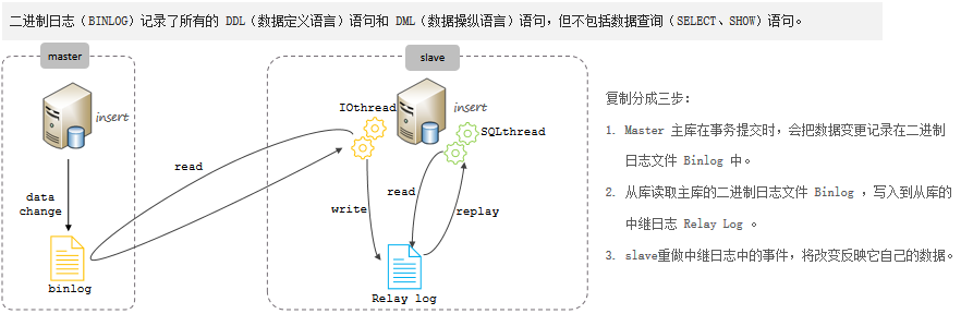 ❒ MySQL主从复制的核心就是二进制日志 ✔ 二进制日志(BINLOG)记录了所有的DDL(数据定义语言)语句和DML(数据操纵语言)语句,但不包括数据查询(SELECT、SHOW)语句。 ❒ 复制分成三步 ✔ Master主库在事务提交时,会把数据变更记录在二进制日志文件Binlog中。 ✔ 从库读取主库的二进制日志文件Binlog,写入到从库的中继日志Relay Log。 ✔ slave重做中继日志中的事件,将改变反映它自己的数据。