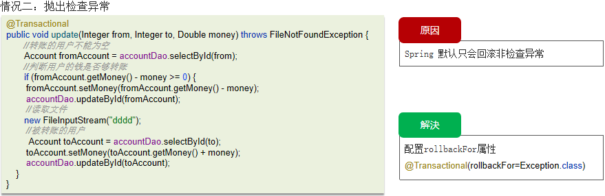 ❒ 情况一: 异常捕获处理 ✔ 事务通知只有捉到了目标抛出的异常,才能进行后续的回滚处理,如果目标自己处理掉异常,事务通知无法知悉。 ✔ 在catch块添加throw new RuntimeException(e)抛出。 ❒ 情况二: 抛出检查异常 ✔ spring 默认只会回滚非检查异常。 ✔ 配置rollbackFor属性@Transactional(rollbackFor=Exception.class)。 ❒ 情况三: 非public方法导致的事务失效 ✔ spring为方法创建代理、添加事务通知、前提条件都是该方法是public的。