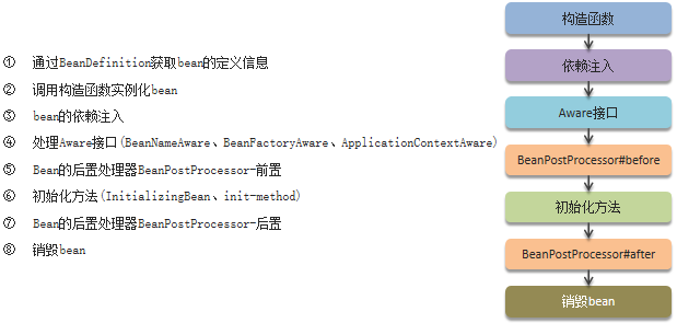 ✔ 通过BeanDefinition获取bean的定义信息。 ✔ 调用构造函数实例化bean。 ✔ bean的依赖注入。 ✔ 处理Aware接囗(BeanNameAware、BeanFactoryAware、ApplicationContextAware)。 ✔ Bean的后置处理器BeanPostProcessor-前置。 ✔ 初始化方法(InitializingBean、init-method)。 ✔ Bean的后置处理器BeanPostPrcessor-后置。 ✔ 销毁bean。 谐音记忆:定时煮味,前化后销 细节版:拿定义,new对象,填依赖,认身份(Aware),前增强,做初始化,后增强,最后毁