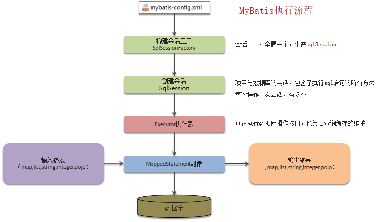 1. 读取MyBatis配置文件:mybatis-config.xml加载运行环境和映射文件 2. 构造会话工厂SqlSessionFactory 3. 会话工厂创建SqlSession对象(包含了执行SQL语句的所有方法) 4. 操作数据库的接口,Executor执行器,同时负责查询缓存的维护 5. Executor接口的执行方法中有一MappedStatement类型的参数,封装了映射信息 6. 输入参数映射 7. 输出结果映射