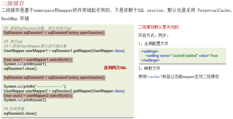 ✔ 本地缓存: 基于PerpetualCache,本质是一个HashMap ✔ 一级缓存(默认开启): 作用域是session级别 ✔ 二级缓存(默认关闭: 作用域是namespace和mapper的作用域,不依赖于session ❒ 一级缓存: ✔ 基于 PerpetualCache的HashMap 本地缓存,其存储作用域为 Session,当Session进行flush或close之后,该Session中的所有Cache就将清空,默认打开一级缓存 ❒ 二级缓存 ✔ 对于缓存数据更新机制,当某一个作用域(一级缓存 Session/二级缓存Namespaces)的进行了新增、修改、删除操作后,默认该作用域下所有 select 中的缓存将被 clear ✔ 二级缓存需要缓存的数据实现Serializable接口 ✔ 只有会话提交或者关闭以后,一级缓存中的数据才会转移到二级缓存中