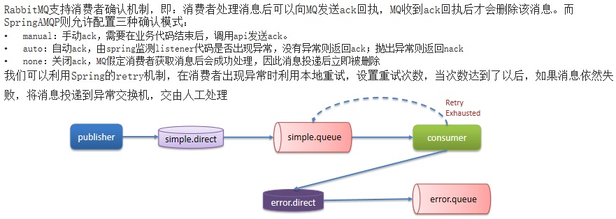 我们可以利用spring的retry机制,在消费者出现异常时利用本地重试,设置重试次数,当次数达到了以后,如果消息依然失败,将消息投递到异常交换机,交由人工处理。