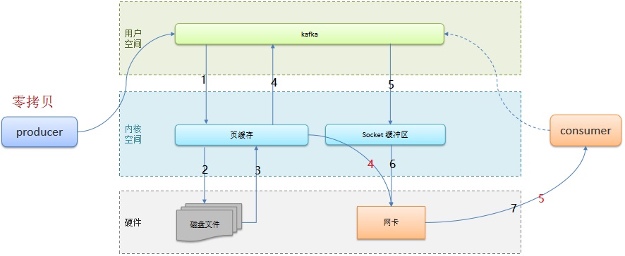✔ 消息分区: 不受单台服务器的限制,可以不受限的处理更多的数据 ✔ 顺序读写: 磁盘顺序读写,提升读写效率(高于随机读写,寻址过程比较耗时) ✔ 页缓存: 把磁盘中的数据缓存到内存中,把对磁盘的访问变为对内存的访问 ✔ 零拷贝: 减少上下文切换及数据拷贝 ✔ 消息压缩: 减少磁盘I0和网络I0 ✔ 分批发送: 将消息打包批量发送,减少网络开销(默认16k,最大条数,默认时间) ❒ 传统数据拷贝 用户态(发起read) -> 内核态(PageCache) -> 硬件(消息) -> 内核态(dma拷贝硬盘数据到PageCache) -> 用户态 -> 内核态(cpu写数据到Socket缓冲区) -> 硬件(dma拷贝数据到网卡设备) ❒ 零拷贝 数据首先通过DMA(Direct Memory Access)从磁盘拷贝到内核态,然后再通过零拷贝机制直接传输到网络卡中。