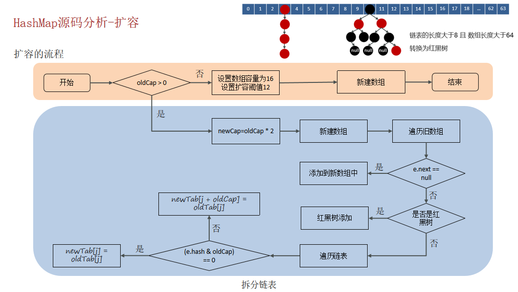 ❒ 扩容过程 ✔ 初始化后第一次添加元素需要调用resize方法进行扩容,数据初始化数组长度为16。 ✔ 以后每次扩容都是达到了扩容阈值(数组长度 * 0.75)。 ✔ 每次扩容的时候,都是扩容之前容量的2倍。 ❒ 扩容之后 ✔ 会新创建一个数组,需要把老数组中的数据挪动到新的数组中。 ✔ 没有hash冲突的节点,则直接使用e.hash & (newCap - 1)计算新数组的索引位置。 ✔ 如果是红黑树,走红黑树的添加。 ✔ 如果是链表,则需要遍历链表,可能需要拆分链表,判断(e.hash & oldCap)是否为0,该元素的位置要么停留在原始位置,要么移动到原始位置 + 增加的数组大小这个位置上。 ✔ 因为 hash 值不变、oldCap 是扩容前的固定值,所以 hash & oldCap 的结果是唯一且确定的。 ✔ 这就保证了每个元素在扩容时只会被分到「原索引」或「原索引 + oldCap」两个位置中的一个,不会有第三种可能。